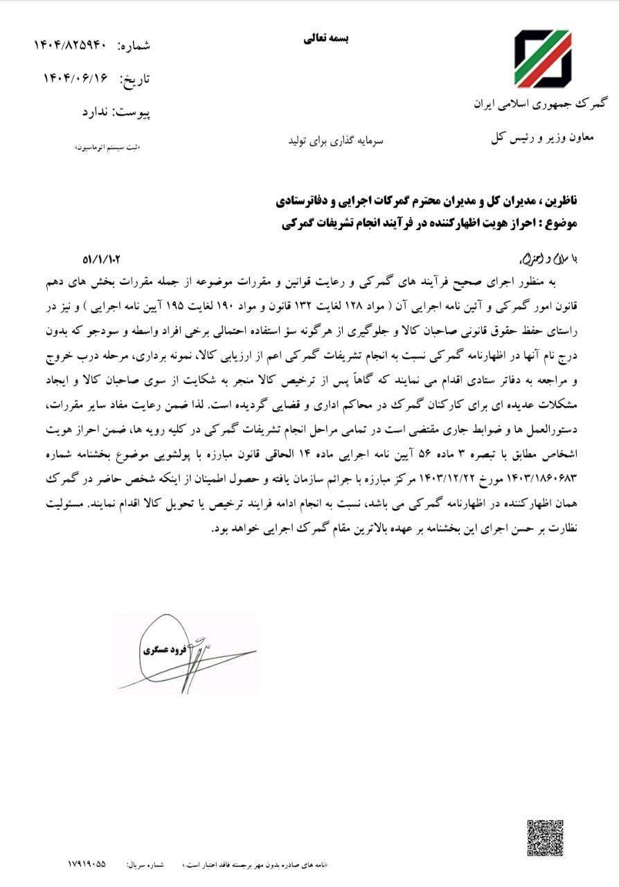 • رئیس کل گمرک ایران ابلاغ کرد : انجام تشریفات ترخیص یا تحویل کالا فقط با حضور اظهار کننده در گمرک